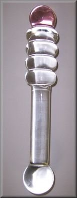Uniquely shaped clear Pyrex glass with rings on one end, and ball shaped tips. One of the tips is pink. Approximately 8 in length and 1 in diameter. This stimulating styled glass is 100% dishwasher safe. Heat it up or cool it down for a new sensation. Each unique style comes with free colorful pouch to keep your toy safe from harm.